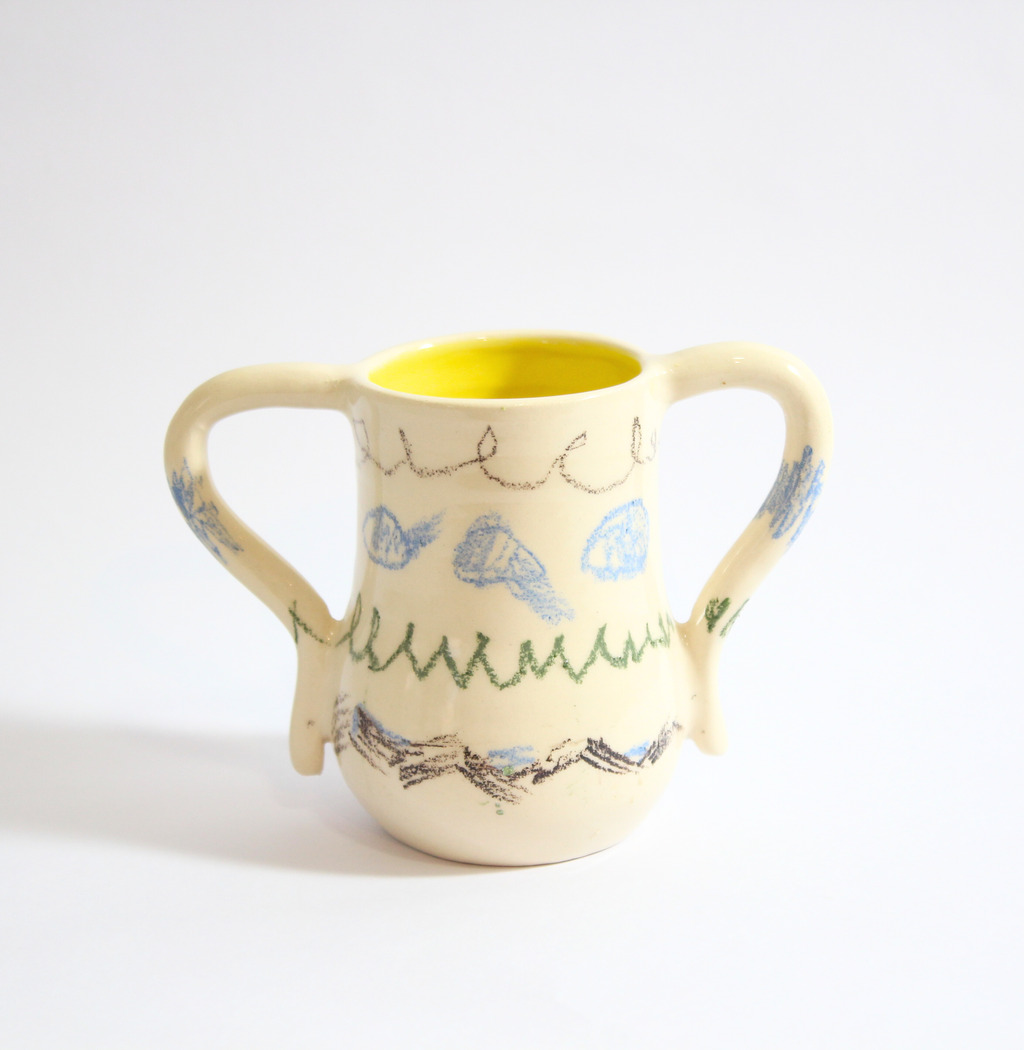 Florero de cerámica dibujado con crayón. Interior pintado con engobe amarillo.